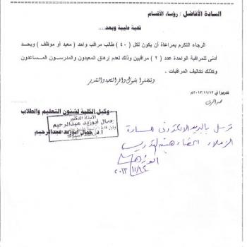 The vice dean for student affairs sent a letter to the heads of the departments to appoint at least one observer (demonstrator or employee) for every 40 students to avoid the exhaustion of…