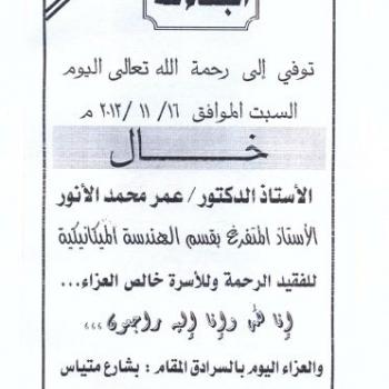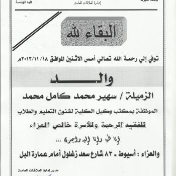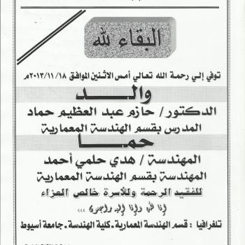 The faculty of engineering would like to express its deepest sympathy to Dr. Hazem Abd El-Azim Hammad, in architectural engineering department , on the demise of his father on Sunday 18-11-2013.