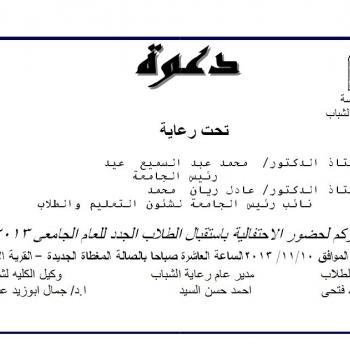 The university is organizaing a welcoming ceremony for the new students 2013-2014  on sunday 10-11-2013 at 10:00 a.m in the new covered hall in the olympic village. This ceremony is held under…