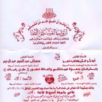 Professor Abo Bakr Ali Muhammad Nasr would like to invite you to the wedding party of his son Dr/Amr Abo Bakr on Thursday 14-11-2013 in assiut university club hall A