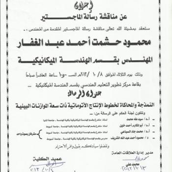 The mecahnical engineering department has approved to form a jury committee to evaluate the master thesis proposed by eng Mahmoud Heshmat Ahmad Abd El-Kader on Tuesday8 -10-2013 at 10.00…