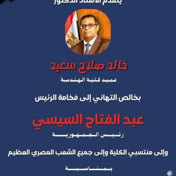 Prof. Dr. Khaled Salah, Dean of the Faculty, extends his sincere congratulations to His Excellency President Abdel Fattah El-Sisi, President of the Republic and Supreme Commander of the Armed…