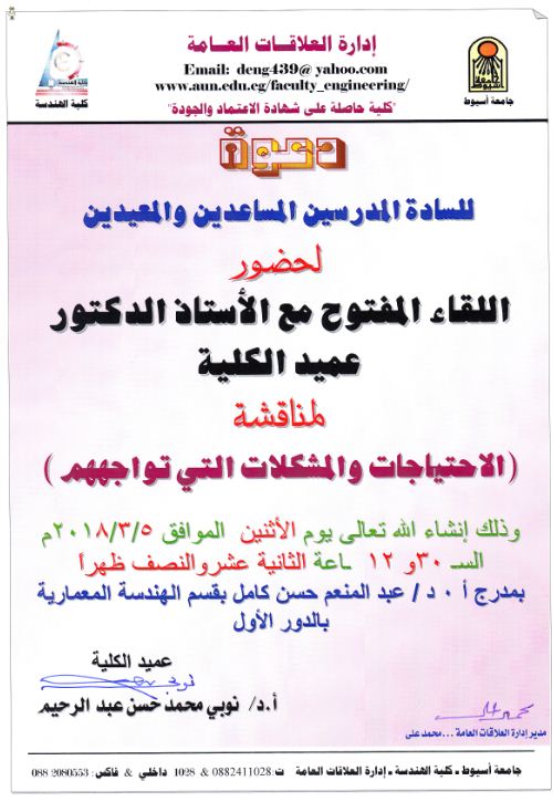 Invitation to an open meeting with the Professor / Dean of the College for Assistant Teachers and AssistantsTo discuss the needs and problems facing them in the Hall of Prof. Dr. Abdel Moneim Hassan Kamel at Department of ArchitectureGod willing, on Monday, 5/3/2018