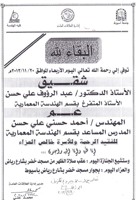 The faculty of engineering would like to express its deepest sympathy to Professor Abd El-Raouf Ali Hassan, the emiritus professor in architectural department, on the demise of his brother on Wednesday 20-11-2013.