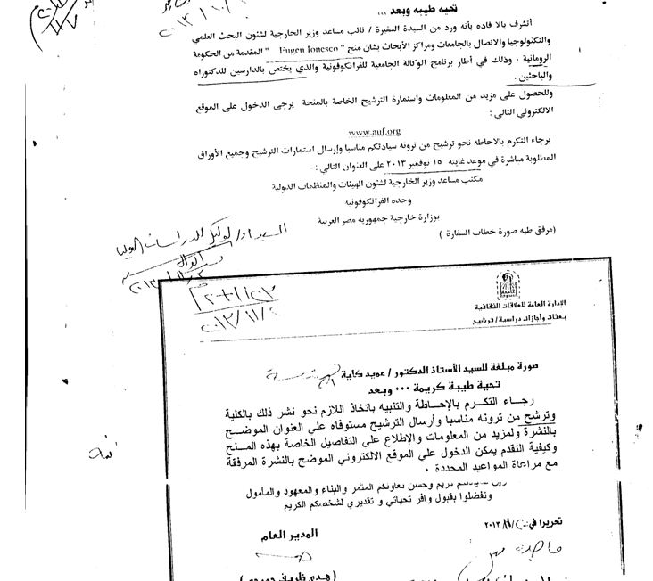 The dean of the faculty professor Muhammad Abo El-Kassem recieved a letter from the romanian government asking him to nominate suitable students to obtain PhD degree scholarship which are offered from the Agence universitaire de la Francophonie (AUF). The deadline to apply for these scholarships: 15-11-2013