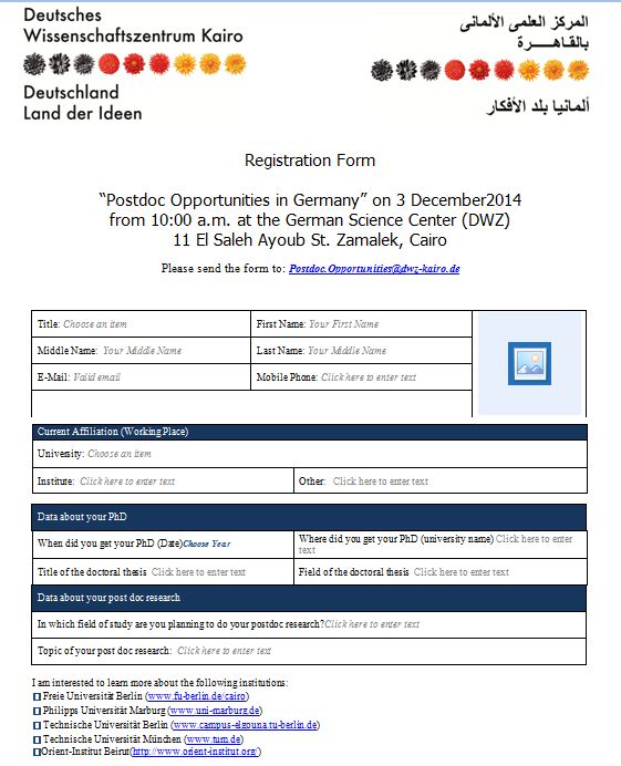 The German Science Centre in Cairo (DWZ) organizes the Event “Postdoc Opportunities in Germany” for outstanding Egyptian postdoctoral researchers on 3 December 2014. The event will be hosted by the German Science Centre and seven of its partner institutes. The German Academic Exchange Service DAAD and Alexander von Humboldt Foundation will present their fellowship opportunities for Postdocs, while Freie Universitنt Berlin, Philipps-Universitنt Marburg, Technische Universitنt Berlin, Technische Universitنt München and Orient-Institut Beirut will give an overview of the research opportunities for Postdoctoral  fellows at their institutions.Please find below the registration from. Registration is mandatory until 23 November 2014.We would like to invite you to join the event and encourage you to forward this message to interested postdoc researchers.
