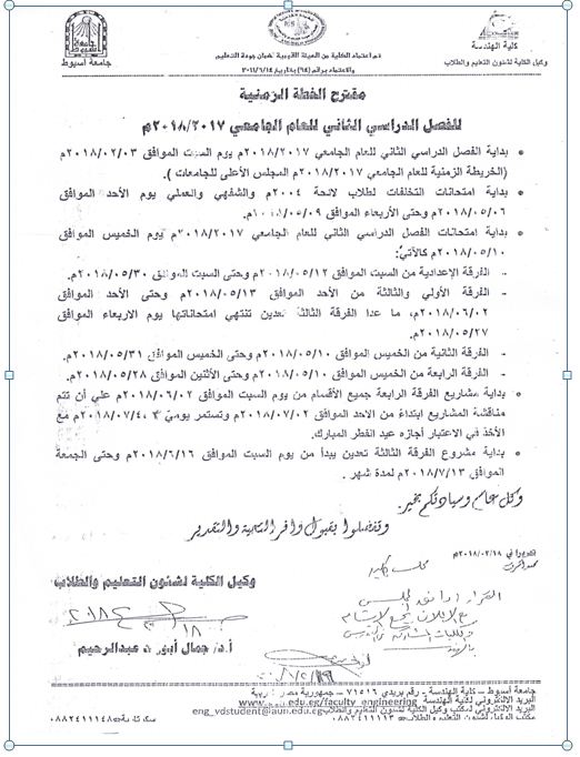 The Board presented the memo submitted by Dr. / Vice Dean for Education and Students Affairs regarding the proposal for the second semester plan for the academic year 2017/2018.   Resolution: Approved by the Council