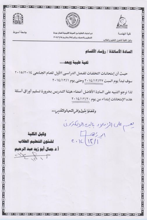 Resit Exams in the Faculty of Engineering 3 December 2014 The resit exams of the first semester for the academic year 2014/2015 will start from sunday 27-12-2014 to 1-12-2014.The faculty staff must deliver their exam papers on 27-12-2014.