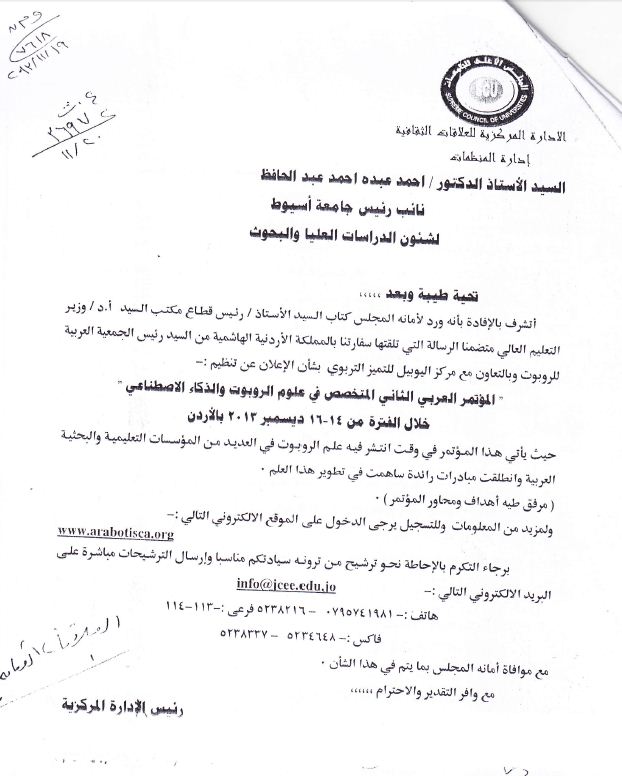 Arab Robotics Association in cooperation with the Jubilee Center for Excellence in Education will hold the second arabic conference for robotics and artificail intelligence from 14-12-2013 to 16-12-2013 in jordon.For more in formation, please visit this link:www.arabotisca.org