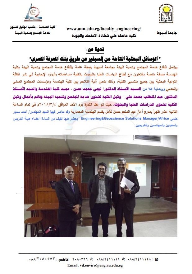 The community service and environmental development Sector of Assiut University in general and the community service and environmental development Sector of the Faculty of Engineering, in particular, continue to cooperate with the study sector and research contributions to the college and its positive roles in the dissemination of a culture of research awareness among all faculty members within the mechanism The synergy between the Faculty of Engineering and civil society institutions and the service and any of the exponent Mr. Nubi Mohamed Hasan-Dean of the Faculty of Engineering and Mr. Alas hurt Dr. Abdulmandial Mohamed Ali – Vice dean for Community service and environmental development and acting Vice dean for studies affairs and research, where the symposium was held on Sunday, 4/3/2018, at 12 p.m. on the runway. Dr. Abdel Moneim Hasan Kamel in the Department of Architecture he was lectured by Mr. Eng. Ahmed Samihelmy Africe/Manager Solutions geoscience&engineering and attended by a few gentlemen Faculty members, repeaters, engineers and graduates