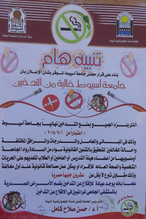 Assiut university committee announces its smoke-free intiative starting from 1/9/2014 and its policy includes all buildings, faculties, labs and university-owned vehicles. Compliance with this policy is grounded in informing and educating members of the university community and visitors about the policy and encouraging those who use tobacco products to seek treatment for tobacco dependence at assiut university hospital.