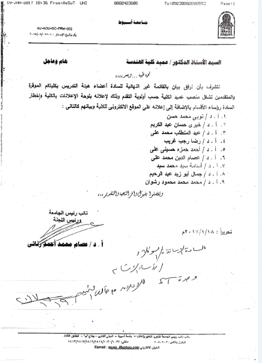 A statement of the final list of the faculty members of the College of Engineering who are applying for the post of Dean of the College 19 January 2017 A statement of the final list of the faculty members of the College of Engineering who are applying for the post of Dean of the College