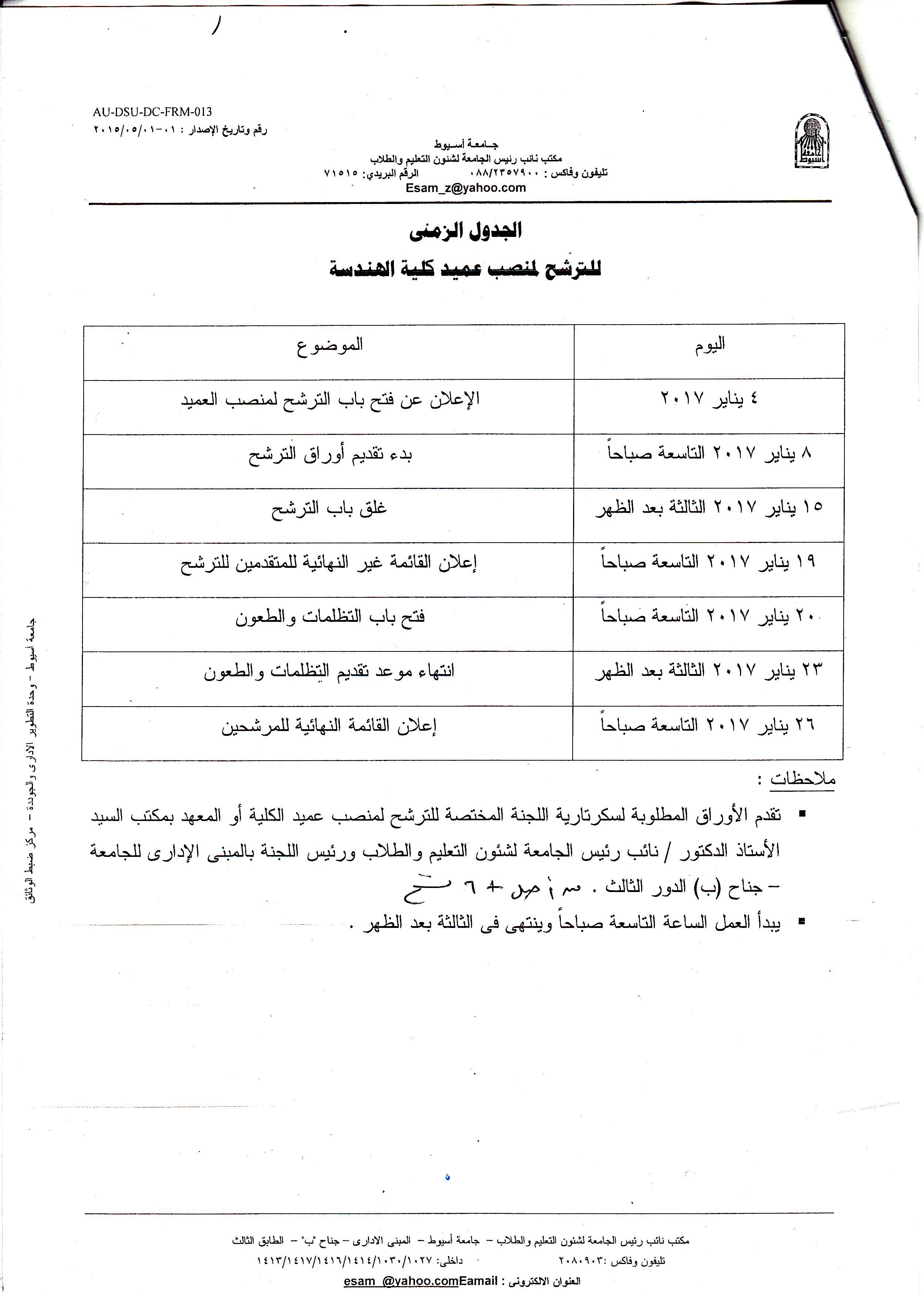 The timetable for applying for the post of Dean of the Faculty of Engineering, Assiut University 4 January 2017 The timetable for applying for the post of Dean of the Faculty of Engineering, Assiut University