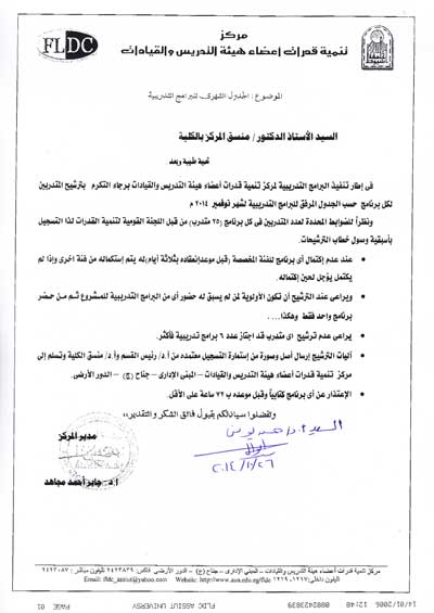 Training Courses For Faculty Members in November 27 October 2014 The Faculty and Leadership Development Center-Assiut University- is offering its timetable for the training courses in november for the faculty members. Please read the terms of conditions before applying for any course.