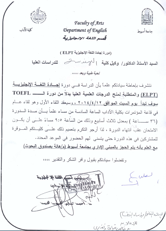 تعقد كلية الآداب دورة اجادة اللغة الإنجليزية (ELPT) بدلا من دورة الـــــTOEFL سوف تبدأيوم السبت الموافق  12/4/2014وسيعقد اللقاء الأول وهو لقاء عام فى قاعة المؤتمرات بكلية الآداب الساعة السادسة مساءً