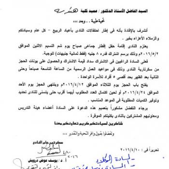 Assiut Unversity Club will hold a breakfast  on Monday celebrating Sham Al-Nassim. The price of the meal is 85 L.E. Reservations will open on Tuesday 12/4/2016 and ends on Sunday in 24/4/…