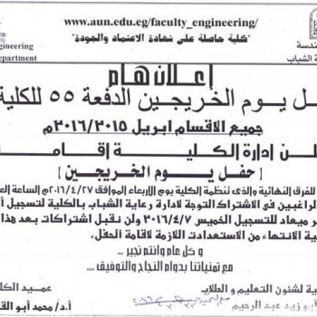 The Youth Affairs of faculty of engineering decided that the 55th graduation ceremony for all the deparments will be held on Tuesday 27/4/2016 at 10:00 a.m. The deadline for booking will be 7/4…