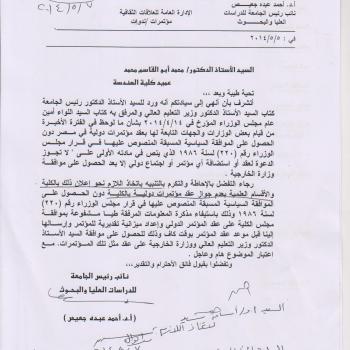 The Egyptian cabinet of ministers decided in 14-4-2014 that no international conferences or meetings will be held without the permission of the ministry of foreign affairs according to law no…