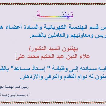 Electrical engineering department would like to congratulate Dr.Alaa El- Din Abd EL-Hakim for his new position as an assistant professor, wishing him all the best.