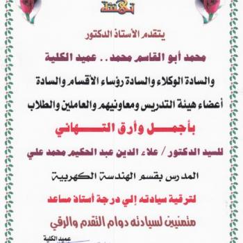 The dean of the faculty and the whole staff would like to congratulate Dr. Alaa El- Din Abd EL-Hakim,electrical engineering department, for being promoted as an assistant professor, wishing him all…
