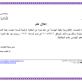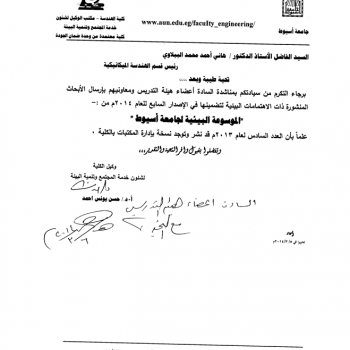 The faculty of engineering asks the faculty members to send their envirnmental research papers to be published in the seventh edition of 2014 of assiut university environmental encyclopedia. The…