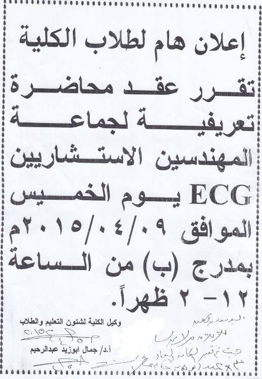 An Orientation about Consultant Engineers 8 April 2015 The Engineering Consultant Group ECG will hold an orientation for students on Thursday 9/4/2015 at 12:00 in amphitheatre B.