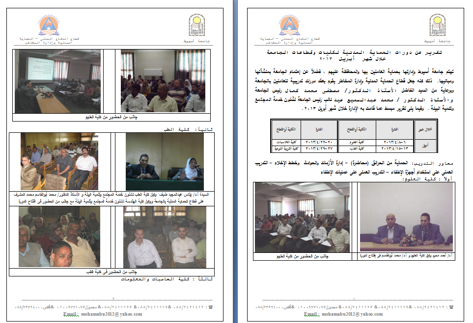 Under the supervision of the president of Assiut university Professor/ Mostafa Mohamed Kamal;the civil protection and risk management sector arranged a training course for the employees of the university.The following report shows the activity of the sector in April.