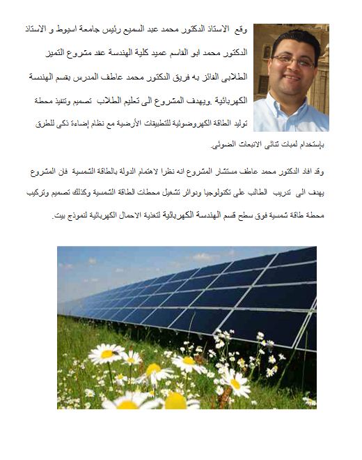 The president of assiut university and the dean of the faculty of engineering signed the contract for the winning excellence student project that was under the supervision of Dr/ Muhammad Atef. The project aims at training the student to design and establish solar energy stations on electrical engineering department.