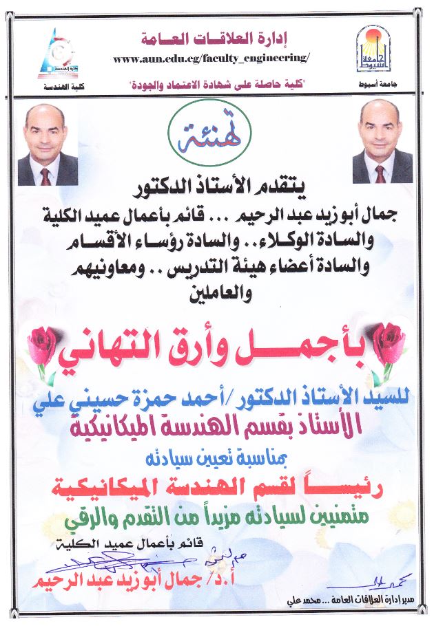 Special congratulations from the Faculty of Engineering to Prof. Dr. Ahmed Hamza Hosseini Ali 1 August 2017 Special congratulations from the Faculty of Engineering to Prof. Dr. Ahmed Hamza Hosseini Ali