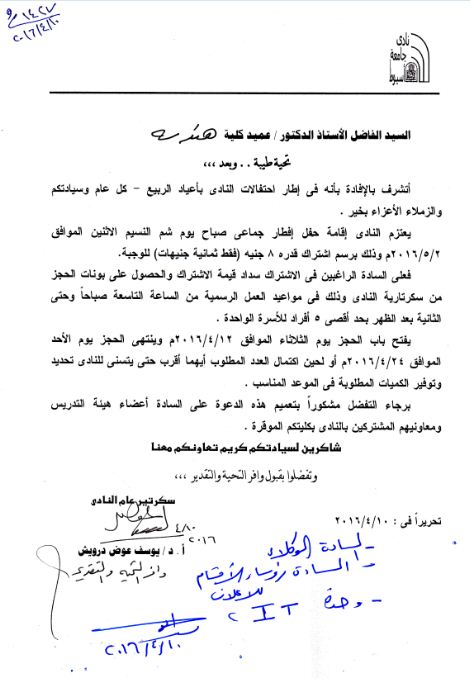 Assiut Unversity Club will hold a breakfast  on Monday celebrating Sham Al-Nassim. The price of the meal is 85 L.E. Reservations will open on Tuesday 12/4/2016 and ends on Sunday in 24/4/2016 at the secretary of the club.