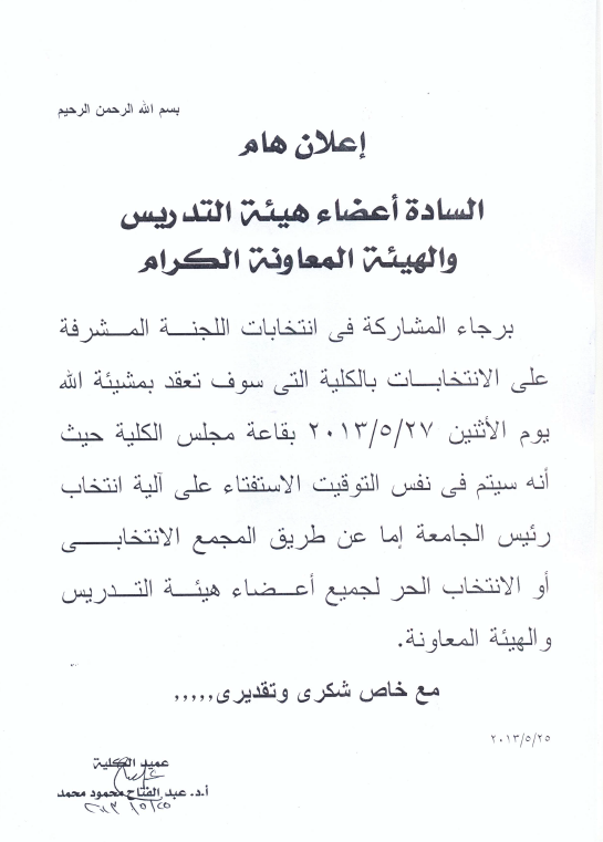 The supervisory committee  for the faculty elections will be elected in the committee hall.The faculty members and the instructors are asked to attend these elections and there will be also a referendum about the mechanism of electing the president of the university.