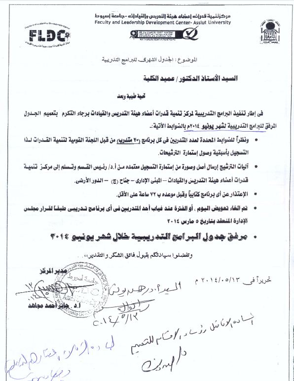 Faculty and leadership development center in assiut university will hold training courses for the faculty staff during June 2014. Priority on reservation due to the limited number of trainees (20).Trainees who attend 6 programs or more will not be nominated.If any member wants to cancel his course he must inform the center before the begining of the course by 72 hours at least.