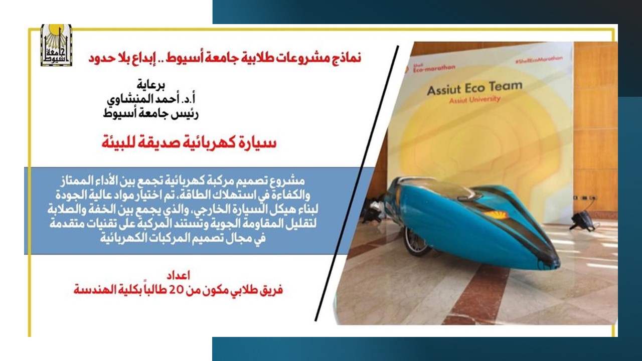 وقدم فريق طلابي بجامعة أسيوط، مكون من 20 طالباً بكلية الهندسة، سيارة كهربائية صديقة للبيئة Assiut Eco Team؛حيث تجمع بين الأداء الممتاز، والكفاءة في استهلاك الطاقة، وذلك من خلال اختيار مواد عالية الجودة؛ لبناء هيكل السيارة الخارجي، والذي جمع بين الخفة، والصلابة بتقنيات متقدمة؛ لمواكبة التطور في مجال تصميم السيارات الكهربائية، ودعم التنمية المستدامة.