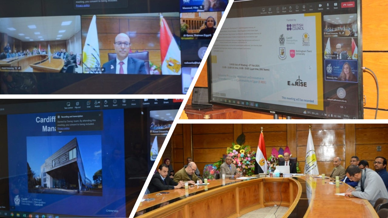 بدأت منذ قليل؛ فعاليات انطلاق مشروع بحثي بجامعة أسيوط بالتعاون مع جامعة كاردف ميتروبوليتان بالمملكة المتحدة، ومشاركة جامعتي نوتنجهام ترنت بالمملكة المتحدة، وجامعة القاهرة، بتمويل من المجلس الثقافي البريطاني، عبر تقنية الفيديو كونفرانس؛وذلك في إطار تعزيز بيئة البحث، والابتكار؛ في مجال الطاقة المتجددة، و الاستدامة في مصر (E_RISE).