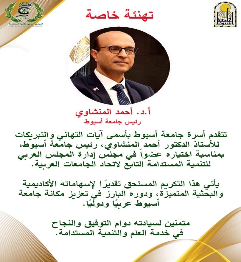 تتقدم أسرة جامعة أسيوط بأسمى آيات والتبريكات إلى الأستاذ الدكتور أحمد المنشاوي، رئيس جامعة أسيوط، بمناسبة اختياره عضواً في مجلس إدارة المجلس العربي للتنمية المستدامة التابع لاتحاد الجامعات العربية.