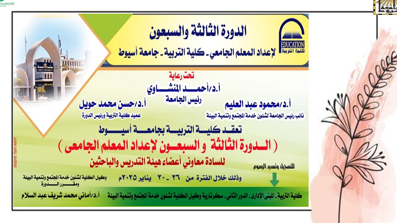تحت رعاية الدكتور أحمد المنشاوى رئيس جامعة أسيوط؛ تُعلن كلية التربية عن تنظيم دورة إعداد المعلم الجامعي؛ لمعاوني أعضاء هيئة التدريس، والباحثين فى نسختها الثالثة والسبعون؛ وذلك خلال الفترة من 26 إلى 30 يناير 2025، تحت إشراف؛ الدكتور محمود عبد العليم نائب رئيس الجامعة لشئون خدمة المجتمع وتنمية البيئة، والدكتور حسن محمد حويل عميد كلية التربية، ورئيس الدورة، والدكتورة أمانى شريف وكيل الكلية لشئون خدمة المجتمع وتنمية البيئة، ومقرر الدورة.