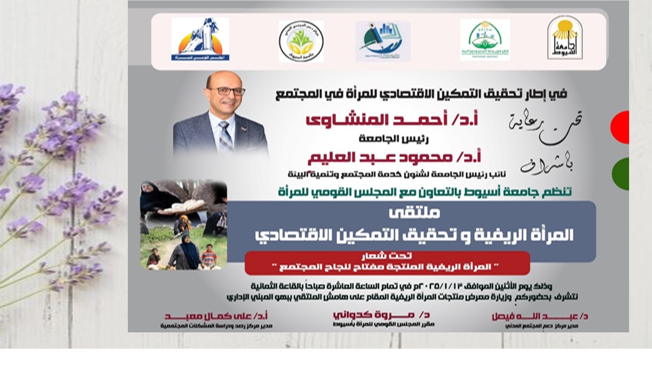 تنظم جامعة أسيوط؛ تحت رعاية الدكتور أحمد المنشاوي رئيس الجامعة، وإشراف الدكتور محمود عبدالعليم نائب رئيس الجامعة لشئون خدمة المجتمع وتنمية البيئة، ملتقى "المرأة الريفية وتحقيق التمكين الاقتصادي"، تحت شعار: "المرأة الريفية المنتجة.. مفتاح لنجاح المجتمع"، بالتعاون مع المجلس القومي للمرأة وذلك يوم الإثنين المقبل الموافق ١٣ من يناير، في تمام الساعة العاشرة صباحاً؛ بالقاعة الثمانية، بالمبنى الإداري بالجامعة.