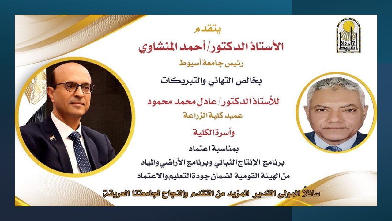 أعلن الدكتور أحمد المنشاوي رئيس جامعة أسيوط؛ عن نجاح كلية الزراعة في الحصول على الاعتماد البرامجي؛ لاثنين من برامجها، وهما: الإنتاج النباتي، والأراضي والمياه، من الهيئة القومية لضمان جودة التعليم والاعتماد.
