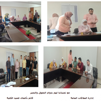 قامت السيدة الأستاذ الدكتور / تيسير حسن عبد الحميد قائم بأعمال عميد الكلية بالإشراف ومتابعة سير العملية الإنتخابية لإختيار الأمناء والأمناء المساعدين للجان إتحاد طلاب الكلية وذلك يوم الثلاثاء…