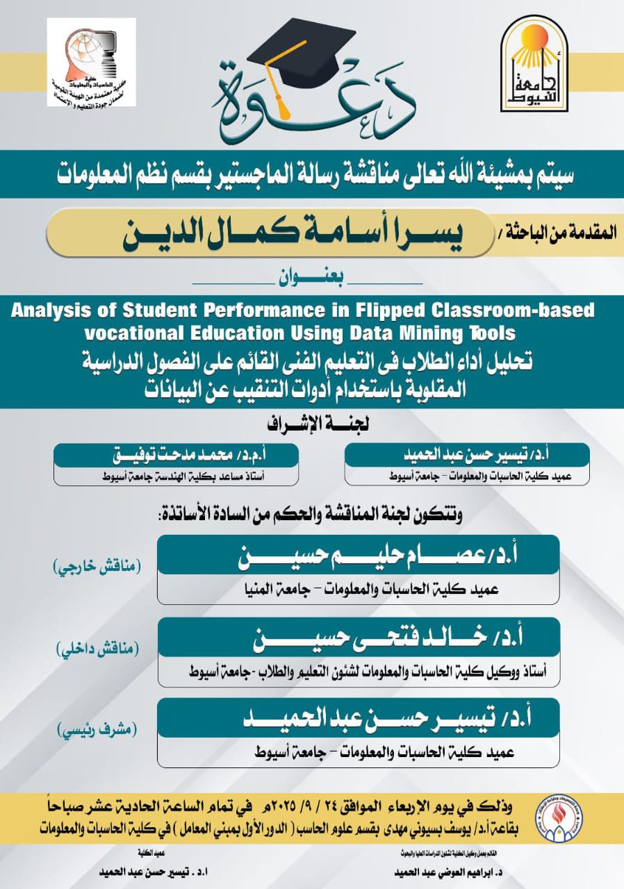 دعوة حضور سيمنار صلاحية رسالة الماجستير الخاصه بالباحث/أسعد نصر الله اسماعيل المعيد بقسم تكنولوجيا المعلومات
