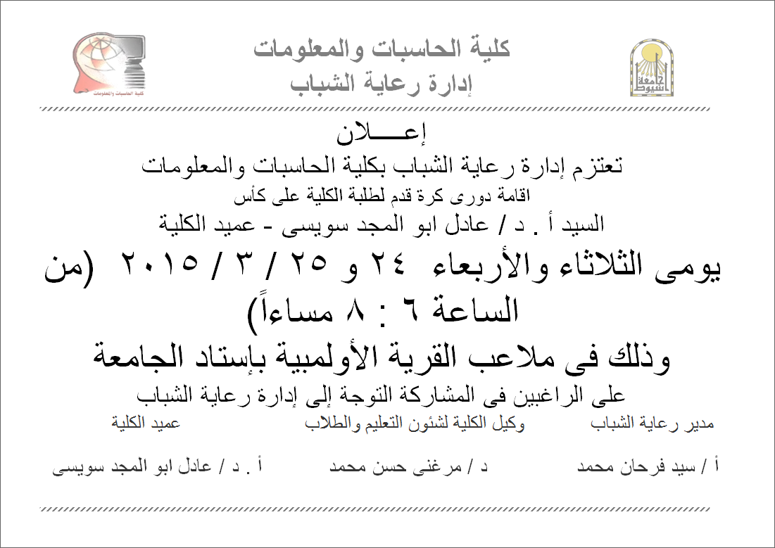 موعد إقامة دورى كرة قدم لطلبة الكلية فى ملاعب القرية الأولمبية بإستاد الجامعة 24 مارس 2015 موعد إقامة دورى كرة قدم لطلبة الكلية فى ملاعب القرية الأولمبية بإستاد الجامعة