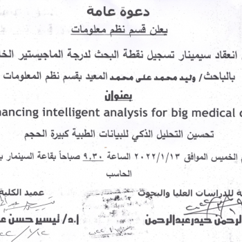 دعوة لحضور سيمنار تسجيل نقطة بحث درجة الماجستير للباحث /وليد محمد على المعيد بقسم نظم المعلومات