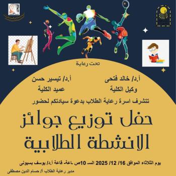 تهنئة ? ✨ تحت رعاية الأستاذ الدكتور/ تيسير حسن عبد الحميد – عميد الكلية الأستاذ الدكتور/ خالد فتحي حسين – وكيل الكلية لشؤون التعليم والطلاب