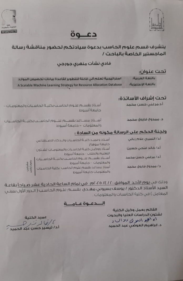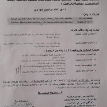 دعوة لحضور مناقشة رسالة الماجستير الخاصة بالباحث / فادي نشات منهري جورجي