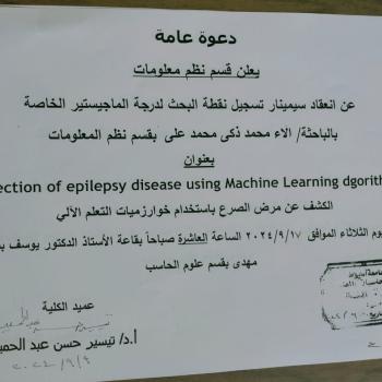 دعوة تسجيل نقطة البحث لدرجة الماجيستير الخاصه  بالباحثه / الاء محمد ذكي بقسم نظم المعلومات