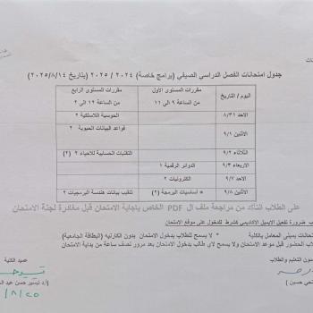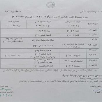جدول امتحانات الفصل الدراسي الصيفي (أهلية) 2024/2025