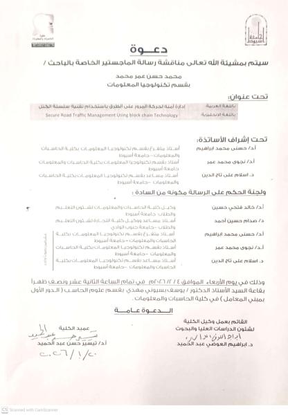 دعوة لمناقشة رسالة الماجستير الخاصة بالباحث/ محمد حسن عمر محمد بقسم تكنولوجيا المعلومات 4 فبراير 2026