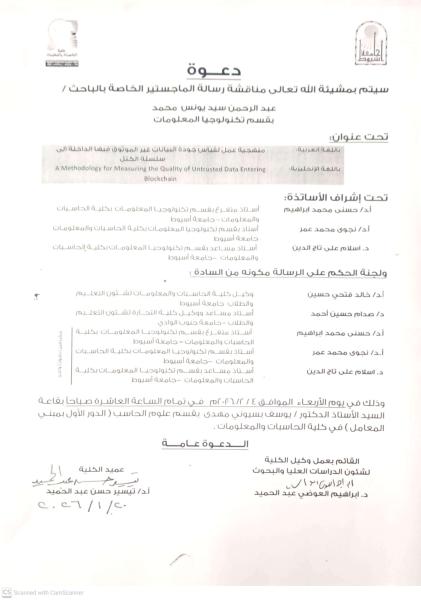 دعوة لمناقشة رسالة الماجستير الخاصة بالباحث/عبد الرحمن سيد يونس محمد بقسم تكنولوجيا المعلومات 4 فبراير 2026