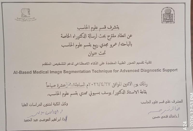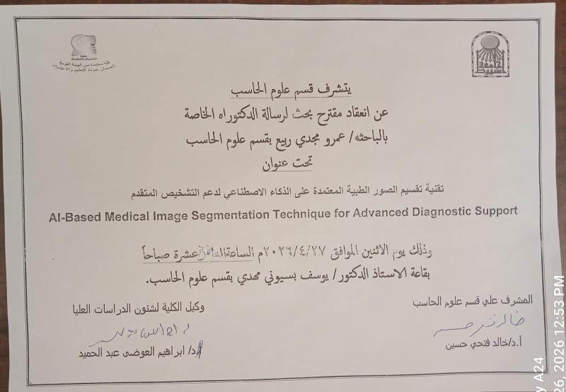 دعوة انعقاد مقترح بحث لرسالة الدكتوراه الخاصة بالباحث / عمرو مجدي ربيع بقسم علوم الحاسب 27 أبريل 2026