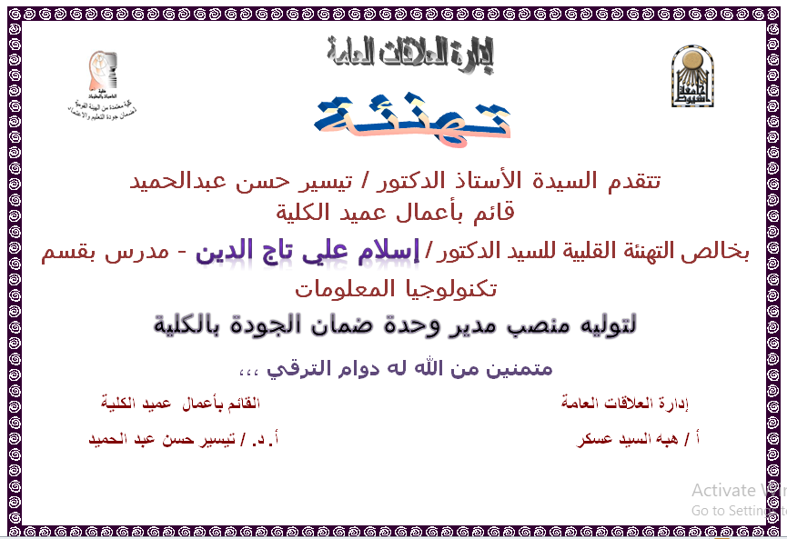 تهنئة للسيد الدكتور / إسلام علي تاج الدين 18 فبراير 2020 تتقدم السيدة الأستاذ الدكتور / تيسير حسن عبدالحميد قائم بأعمال عميد الكلية بخالص التهنئة القلبية للسيد الدكتور / إسلام علي تاج الدين - مدرس بقسم تكنولوجيا المعلومات لتوليه منصب مدير وحدة ضمان الجودة بالكلية متمنين من الله له دوام الترقي ،،،